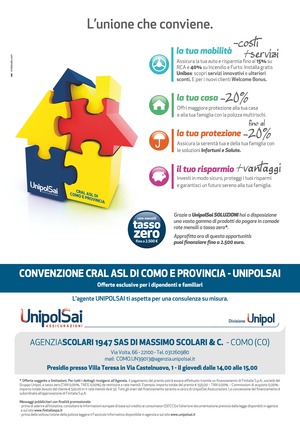 - NEW!! SPORTELLO CONSULENZA ASSICURATIVA: da GIOVEDI 12 marzo dalle ore 14 alle ore 15 un consulente UNIPOLSAI sarà in sede in via Castelnuovo per offrire consulenza Assicurativa, in forza della nuova Convenzione appena stipulata che garantisce fino al 15%-20% di sconto su tutte le polizze UNIPOLSAI, comprese le NUOVE polizze Auto.